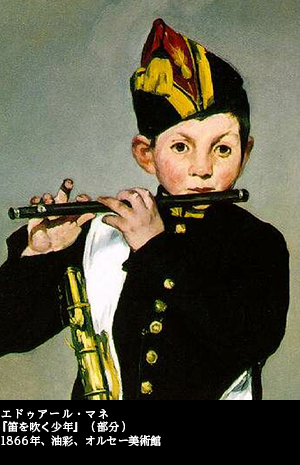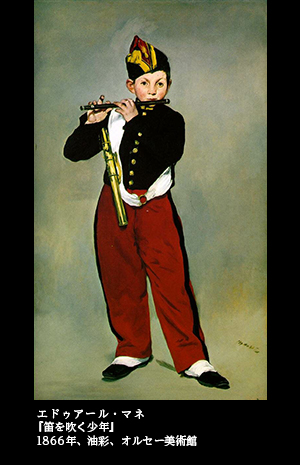 そして最後にもう1点、マネの手になる音楽の絵として、究極の座に位置する作品を見よう。『笛を吹く少年』(1866 オルセー美術館)――。誰もが1度は複製画なりで目にしているであろう、イコン的な超有名絵画だ。