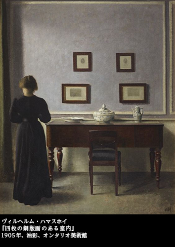 ハマスホイの絵画は、「静寂の詩人」と形容される。それはいかにもその通りなのであるが、静寂のなかに不思議な饒舌、雄弁が秘められている。具体的な物語のストーリーとはならずとも、饒舌の気配、記憶の痕跡が、生きている。