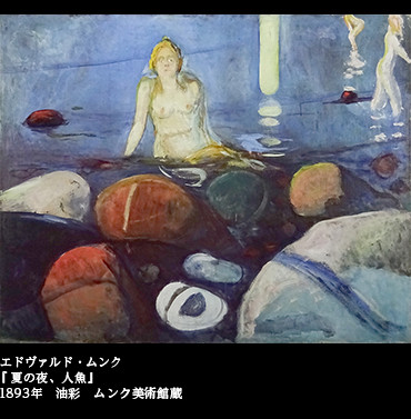 『夏の夜、人魚』(Summer Night, Mermaid 1893)という作品では、タイトルにはっきりと夏の夜である旨、明示されている。しかし今度は、光の正体――太陽か月かがタイトルに付随していないので、この絵に現れた水面上の光の帯が白夜の陽光なのか月光なのかは、結局は結論が出ずじまいで、各人の判断に委ねられている。