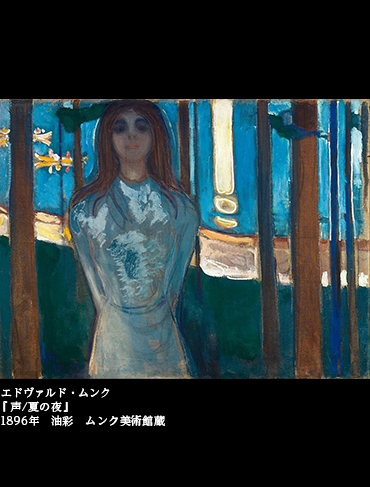 『声/夏の夜』(The Voice/The Summer Night 1896)は、木立のなかにこちらを向いて佇む若い女が描かれる。森の彼方のフィヨルドの湾(または湖水)にはボート遊びの人たち(男たちであろう)が船を浮かべていて、そのはしゃぎ声が風に乗って聞こえてくる。女性の右側には、水面に長く伸びたべろのような光の帯が、曰くありげに、てらてらと輝く。