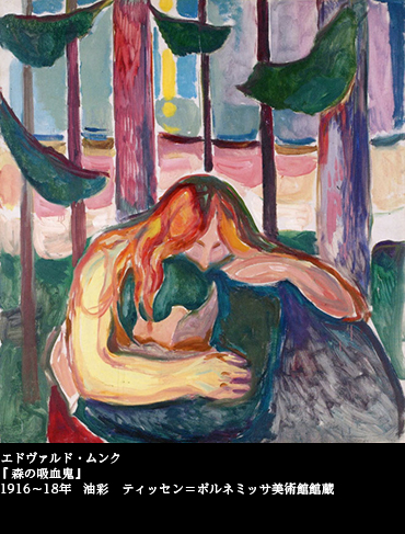『森の吸血鬼』(Vampire in the Forest 1916~18)にも、べろのような光の帯が現れる。女性の吸血鬼に命を吸い取られてしまう男というイメージは、いくつか同工異曲の絵画に登場するが、光の帯とともに提示されているのがこの作品のユニークな点だ。