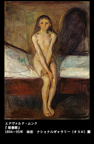『思春期』(1894~95)は、その手の代表作。少女が娘に変わろうとする時期、己自身が秘める性のおぞましさに気づき、慄くさまが描かれる。おそらくは初潮を迎えた日なのだろう。そう思って見ると、ベッドにはそれらしき染みもある。