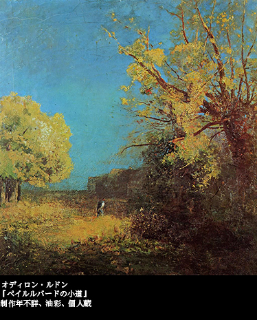 『ペイルルバードの小道』、『ペイルルバードのポプラ』は、そういう意識のもとに描かれた絵で、ここでは色彩がとり入れられている。油彩画だが、ともに制作年代が不詳で、というのも、ルドンはこれらの身の回りの風景画を、自分の手元に秘匿し、どこにも出品しなかったからである。