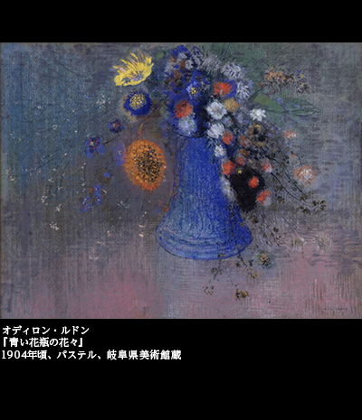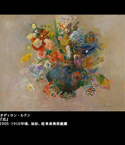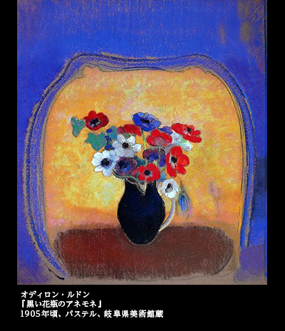 岐阜県美術館の収蔵品のなかにも、ルドンの花の絵はある。『青い花瓶の花々』(1904頃)、『黒い花瓶のアネモネ』(1905頃)など。これらは、パステルを使った絵になる。油彩でも、『花』(1905~1910頃)という作品がコレクションのなかにある。