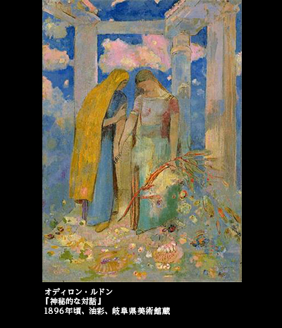 『神秘的な対話』(1896)は油彩画だが、背景にピンクに染まる雲が流れる神殿に、2人の女がたたずんでいる。右側の眼を閉じ、憂いに沈んだ女に向けて、左側の長い髪(ベール?)の女が諄々と何かを語りかけている。