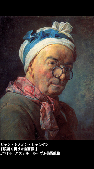 この時、シャルダン80歳――。精悍さという点では、75歳の自画像に比べ、落ちているだろう。いくぶん痩せもした。つる(テンプル)のない鼻眼鏡をつけ、白いボンネットにはブルーのリボン状の帯を結んでいる。