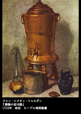 『銅製の給水器』(1733 ルーブル美術館蔵)――。でんと画面中央に置かれた無機質の給水器が、一見、素っ気ないくらいに直截に、物としての揺るぎない絶対性をもって、いかにもオブジェ然として描かれているのは、何か時を超えた奇跡を見るような思いに駆られる。