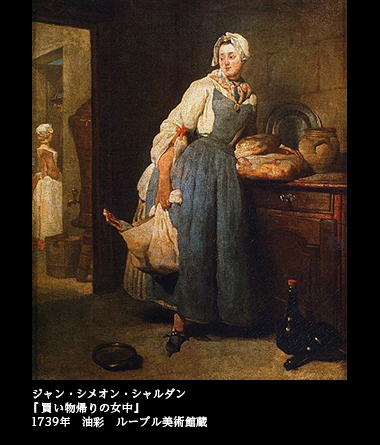 シャルダンの働く女性たちを描いた作品のなかでもつとに世に知られた『買い物帰りの女中』(1739 ルーブル美術館蔵)でも、こうした特徴――、多重構造の空間性や女中たちを描く階級性といった視点は等しく貫かれている。しかも、嬉しいことに(!)、奥の部屋では若い女中とともに、かの銅製の給水器が半身ほど姿を見せている。