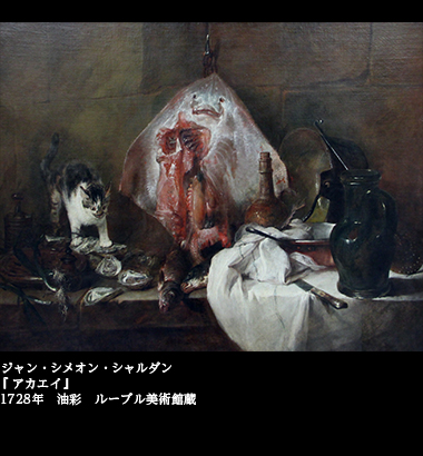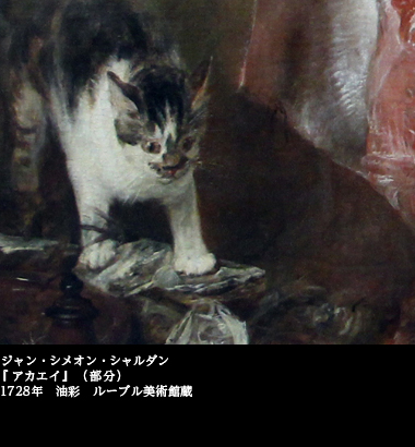 シャルダンはこの他にも、いくつかの猫絵を残しているが、いずれも、力を溜めこみ、いざ動かんとする跳躍直前の姿で描かれている。生と死の葛藤のドラマに於いて、猫は生の象徴として登場させられているのだ。