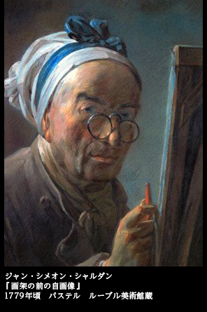 最後の自画像と推定されるこの作品が、イーゼルを前に、赤い筆記具(パステル鉛筆?)を手にした絵であることが、なんとも微笑ましく、シャルダンその人らしい。長い絵画人生そのものが、そこに結晶している。