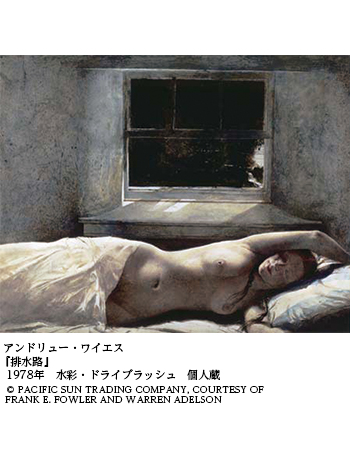 『排水路』は1978年の作、ワイエスが好んだドライブラッシュ技法(水気を絞った絵筆で描く水彩画の技法)によって描かれている。「排水路」は原題では「Overflow」だが、窓外に流れが見えている農場の水路のことをいう。
