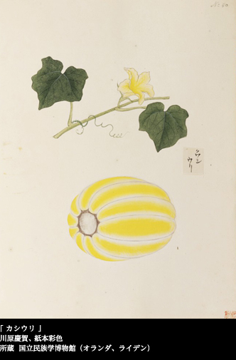 原慶賀の絵における植物学的傾向は、根を食用にしたり、実を結ぶものを描く段になると、いっそう顕著になる。例えばニガウリ(ゴーヤー)やカシウリ(マクワウリ)などウリの類いでは、花や葉に併せて下に実を描いている。ヘチマやキュウリも、しかりだ。