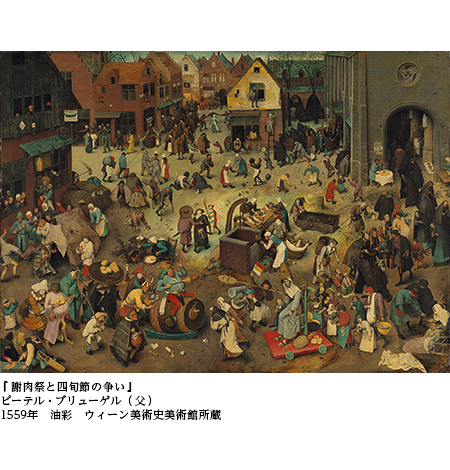 美術史美術館は何度か訪ねたが、『謝肉祭と四旬節の争い』は、趣向の奇抜さや尽くし絵としての徹底ぶりには驚嘆しても、その意味について深く考えることがなかった。画面の左側が謝肉祭で右側が四旬節、その両者の代表が騎馬戦さながらに
