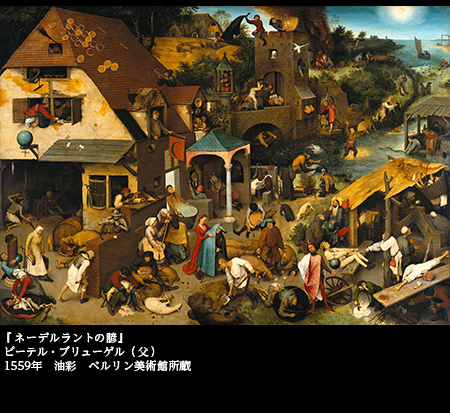 1559年に描かれたのが『謝肉祭と四旬節の争い』と『ネーデルラントの諺』――。翌1560年に描かれたのが『子供の遊戯』――。ほぼ同時期に描かれたこれらの尽くし絵は、ブリューゲルの初期を代表する傑作であり、その実、ブリューゲルはこの3部作によって、画家としての個性を確立した。今日私たちが知るブリューゲルらしさは、まさにこれらの尽くし絵3部作から始まったのである。