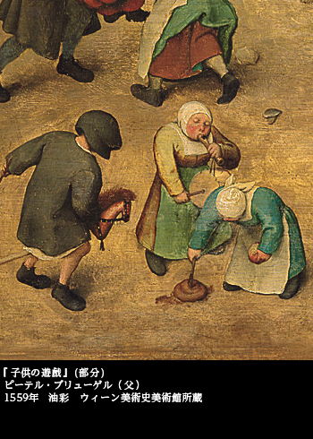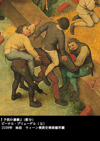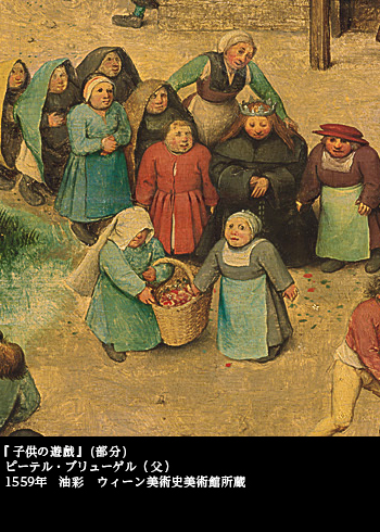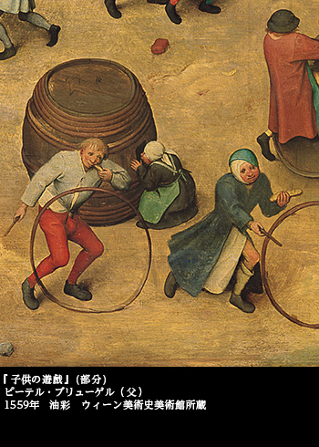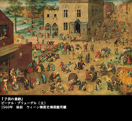 560年に描かれた『子供の遊戯』を見よう。これも、尽くし絵である。総勢250人ほどの子供たちが、80種類を超す遊戯に興じている。ひとつの町が子供たちに占領されてしまったようだ。