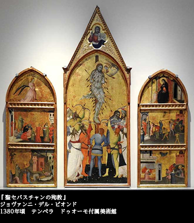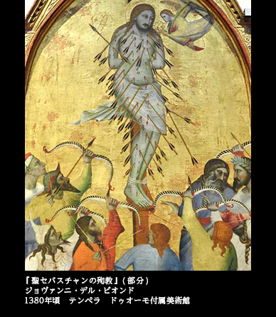 個々の作品を見よう。14世紀、まだゴシックから抜けきれない時代の画家、ジョヴァンニ・デル・ビオンドによる『聖セバスチャンの殉教』は、祭壇画として、無数の矢を受けた姿で描かれた(1380頃 ドゥオーモ付属美術館)。疫病の守護神としての性格が強く、その肉体は美化を免れている。そもそもこれほど矢がたくさん突き刺さっていていれば、、美しき肉体を描くどころではあるまい。