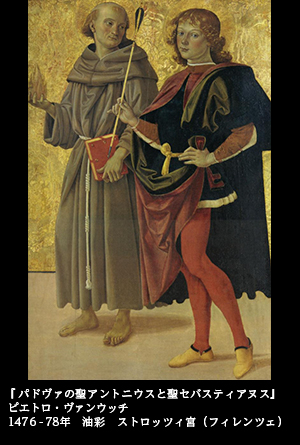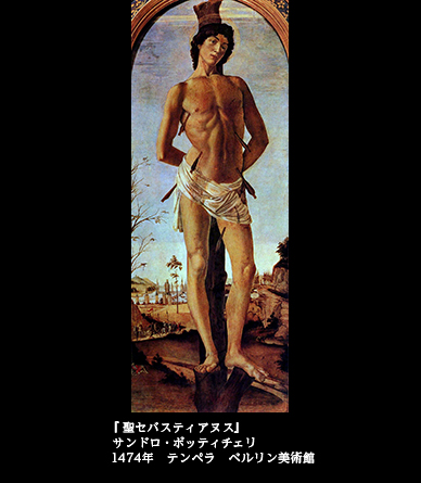 約百年の時を経て、フィレンツェの若き画家、サンドロ・ボッティチェリがこの殉教者を描いている。『聖セバスティアヌス』(1474)――。時代的には、ルネサンスにおける聖セバスチャン隆盛の走りであると見てよいだろう。