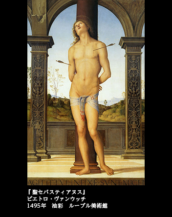 ボッティチェリと一緒にシステナ礼拝堂の天井画を手がけたと言われるペルジーノ(ピエトロ・ヴァンウッチ)が、1495年に描いたとされる『聖セバスティアヌス』を見よう。
