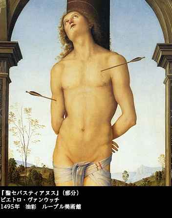 それにしても、聖母子を挟んで、聖ヨハネと聖セバスチャンが守護神として左右を固めたというのは、本稿にとっては極めて刺激的だ。ダ・ヴィンチが描いた聖ヨハネが、官能的なエロスに満ちた美男であったことを先に見たが、それより20年ほど前に、聖ヨハネと聖セバスチャンが同じ土俵に並べられ、しかも対の相手となる聖セバスチャンは著しく美形化を授けられているのである。