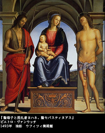 驚くべきことに、この絵より2年前にペルジーノが描いた聖母子像に、聖セバスチャンがそっくりなポーズで加わっている。