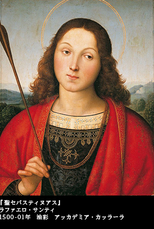 男性殉教者の優美なる女性化という点になると、この人のこの絵も外せない。聖母子の画家と呼ばれたラファエロ・サンティの描いた『聖セバスティアヌス』(1500~1501)――。