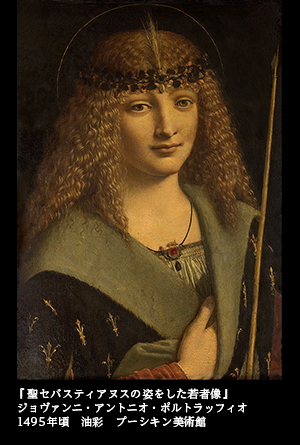 ひょっとすると――と思われるのが、ダ・ヴィンチの弟子であったジョヴァンニ・アントニオ・ポルトラッフィオが描いた『聖セバスティアヌスの姿をした若者像』(1495頃 プーシキン美術館蔵)に刺激を受けたのではないかという疑念である。