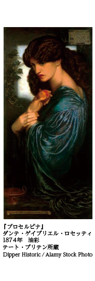 ロセッティの描いたプロセルピナは、食べかけのザクロの実を手にしていることから、冥府での姿と知れる。後方に射す地上の光に憧れながらも、冥府に閉じ込められた身の上を嘆くしかない。美しさの中にも深い憂いを湛えた悲劇の女神なのである。