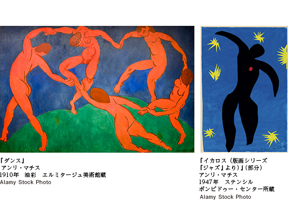 東京都美術館でのマティス展に来日した作品の中に、『イカロス(版画シリーズ『ジャズ』より)』(1947)という切り絵による作品があった。単純なフォルムの中、踊り手がしなやかに舞い、人間の解放が謳われる……。ふたつの世界大戦を含む40年近い歳月を経て、マティスはなおもマティスなのである。