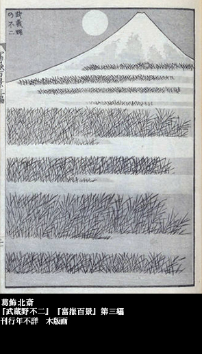 近世初期、「武蔵野図屏風」と呼ばれる、風情に富む武蔵野の原野を描いた屏風絵が流行した。手前に秋の草花を配し、奥に富士山が姿を見せるという構図がいくつも見られるが、北斎はそれを踏まえてこの絵を描いたらしい。