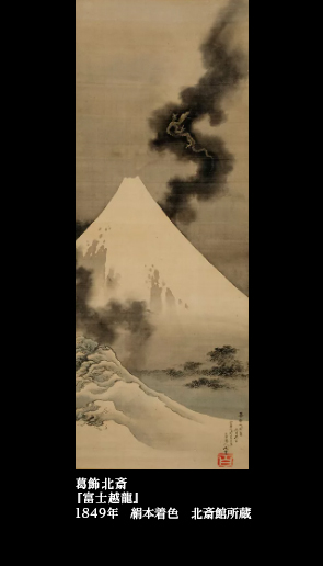 『富士越龍図』(北斎館所蔵)――。雪を冠った白い富士を巡りながら黒雲が湧き立ち、その雲とともに龍が天に昇って行く。自己に龍を重ねた、遺作を意識した作品である。