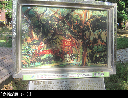公園を縫う散歩道に沿って、全部で9点の陳澄波の作品のパネルが飾られている。入り口付近の1点目は、1928年に描かれた有名なひまわりの自画像だが、その他は、基本的にこの公園の風景を描いたもののようだ。しかも、作品パネルの置き場所が、絵の中の光景と重なる位置に選定されているので、おのずと興味がわく。