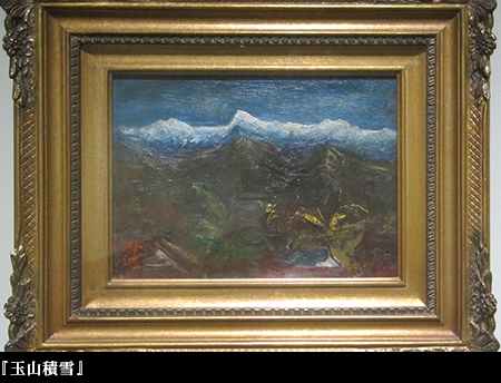嘉義の街並みの彼方に聳える山々のさらに奥に、玉山を筆頭に、白い雪をかぶった高峰が続く。玉山は標高3952メートル、台湾最高峰の山である。生涯の最後に描いた作品ということもあって、台湾の行く末を見守ってほしいと霊峰に願う陳の祈りが聞こえてくるような気がする。