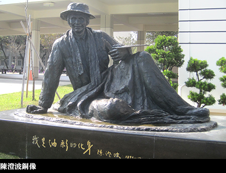 嘉義を離れる前に、市の北部、嘉義市政府文化局を中心にした広場の一角に飾られた、陳澄波の銅像を訪ねた。すぐ近くを、阿里山に向かう登山列車が走る。銅像は、予想していたものよりも大きい。立像ではなく、人魚か何かのように、上半身は起きているものの下半身は横に伏している。左手はパレットをもち、絵筆を握っている。堂々として雄勁な力に満ち、絵にかける陳の一途な情熱がよく表れている。