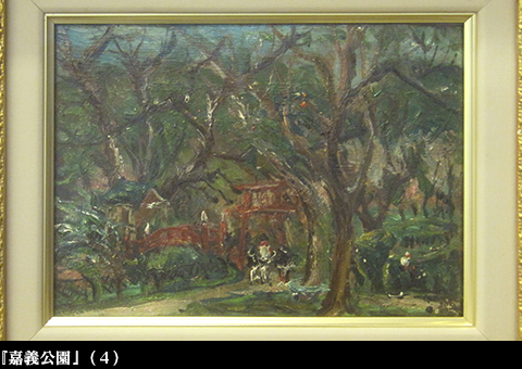 ありがたいことに、ここでは、陳澄波の真作3点を目にすることができた。その中のひとつは、嘉義公園に写真パネルがたてられていた『嘉義公園(4)』であった。赤い鳥居や太鼓橋を前に親子連れが描かれた絵である。嘉義公園の現場に立ってからさほど時間が経過していないこともあって、懐かしいというか、写真でしか知らなかった親戚に、ようやくにして会えたような心持である。