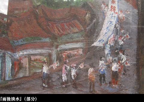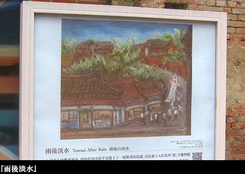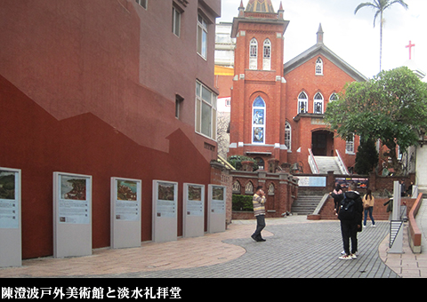 行く手にそびえる教会堂「淡水礼拝堂」は、陳の作品にもしばしば顔を出す。オープンギャラリーの場所として、これほど適した所もあるまい。余氏の言う通り、複製画ではあっても、オリジナルのタッチやニュアンスが巧緻に写しこまれ、陳の作風をうまく伝えている。しかも、それぞれの絵に付された解説は、中国語だけでなく、英語、日本語も添えられており、その気遣いが嬉しい。