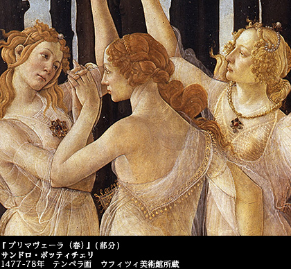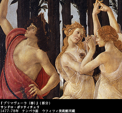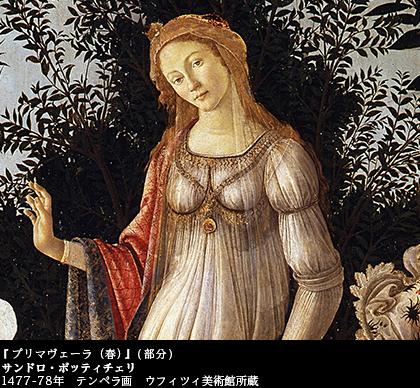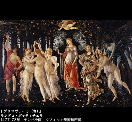 ボッティチェリの作品中、『ヴィーナスの誕生』と並んで世に知られた代表作は、『プリマヴェーラ(春)』であろう。『ヴィーナスの誕生』と同じく、ウフィッツィ美術館の所蔵になり、1477年から78年にかけて描かれた。