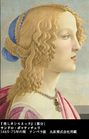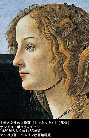 作品は、右手から眺めたシモネッタの横顔である。『ヴィーナスの誕生』でも見られた巻きつくような金髪。額の下方に細い弓型の線を引く眉。まっすぐに開かれた澄んだ瞳。整った鼻梁。小ぶりで可愛らしい唇。ほっそりとした三日月型の顎……。どこを見ても、無駄のない、すっきりとした美が輝いている。