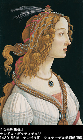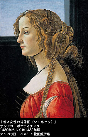 真横から描く肖像画は、この時代によく見られたスタイルだが、ボッティチェリはシモネッタの死後も、このスタイルの肖像画で彼女の面影を追い続けた。