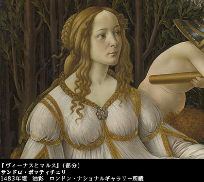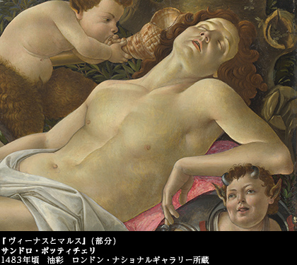 『ヴィーナスとマルス』(1483頃 ロンドン・ナショナルギャラリー)――。軍神マルスは鎧を脱ぎ、下腹部を布で覆うのみで横たわり、忘我の、いささかしどけない姿をさらして、深い眠りのさなかにある。愛の女神のヴィーナスは、薄物の白い衣装を着て、睡眠中のマルスを眺めやる。二人の周囲には、マルスの剣や兜などの武具を用いて、いたずら小僧(半人半獣のサテュロス)たちが戯れている。