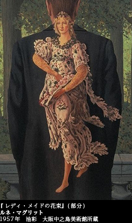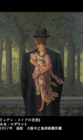 そんなことを考えているうちに、ひとつの絵を思い出した。ルネ・マグリットの『レディ・メイドの花束』(1957年 大阪中之島美術館)――。後ろ向きの山高帽の紳士が、背中に『プリマヴェーラ』のフローラを抱えている。個性の見えにくい、何の変哲もなく見える男の胸に、実は永遠の美の女神が生きている。