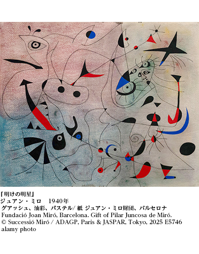 不思議なことに、ここには悲惨や苦渋は現れず、むしろ希望が、祈りのように美しく結晶している。制作から85年、新たな時代の危機のさなかに、ミロの祈りは、文字通りの「明けの明星」として、輝いてやまない筈である。