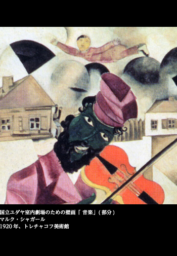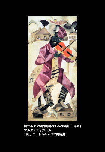 1913年に描かれた「The Fiddler(ヴァイオリン弾き)」の絵は、雪に蔽われた町並みを背景にヴァイオリン弾きを中心に据え、正面から描いたもので、その姿はなるほど、いかにもロシアの村のユダヤ人そのものだ。両足を「く」の字型に曲げて開き加減にし、顔を傾けて弾くところなど、1920年の「音楽」(ユダヤ劇場の壁画)もこの絵を踏襲している。顔が緑色であるのも共通している。