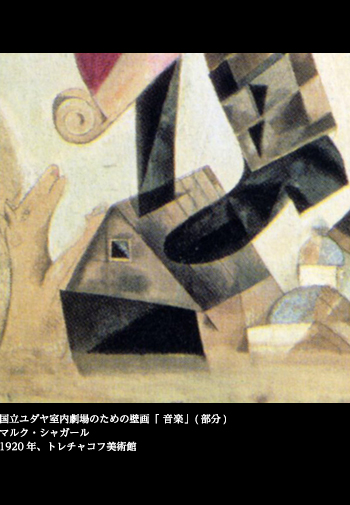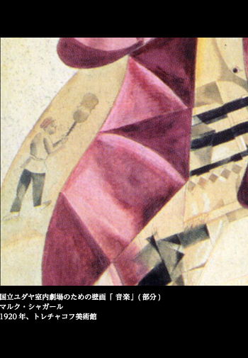 1920年、シャガールは翌年にモスクワにオープンするユダヤ劇場を飾る一連の壁画を完成させた。「ユダヤ劇場への誘い」、「婚礼の祝宴」、「音楽」、「舞踊」、「演劇」、「文学」、そして「舞台上の愛」。日本でもこの壁画シリーズの展覧会が何度か開かれているので、実物を見た読者もいることだろう。