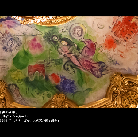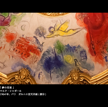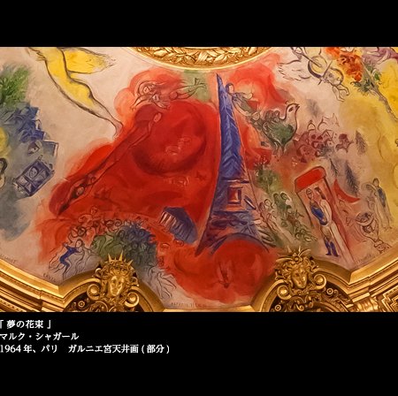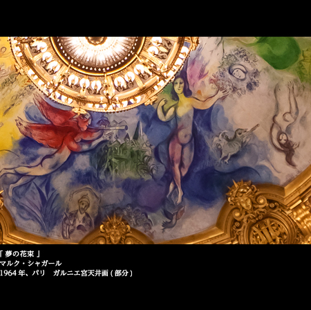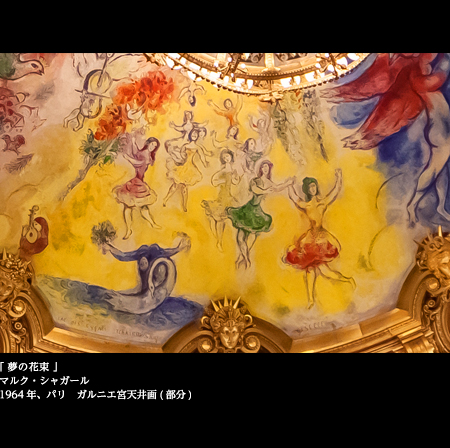 1964年、時の文化相アンドレ・マルローの依頼を受け、シャガールはここに「夢の花束」という新しい天井画を完成させた。歌劇場なのだから、音楽を聴き、オペラやバレエを鑑賞するのもよいが、ここでは特にシャガールの天井画をたっぷりと味わいたい。