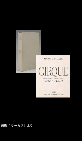 シャガールがサーカスを描くようになった直接のきっかけは、1920年代の半ばに画商のヴォラールから製作を勧められたからだと言われるが、画商のアドバイス以前に、本質的にその世界に惹かれるものがあったことは間違いなかろう。いくつもの油彩の作品を残しもし、また1967年には、リトグラフによる版画集「サーカス」を出している。
