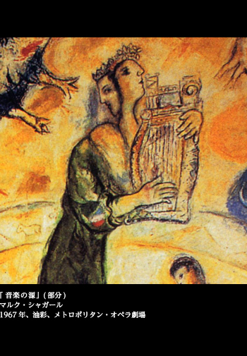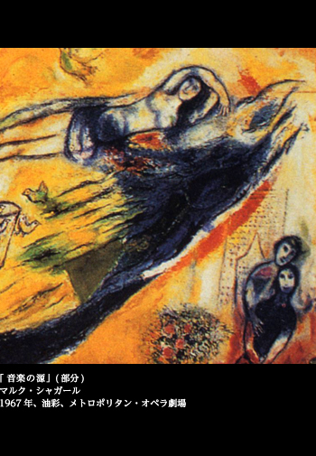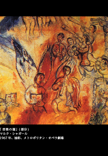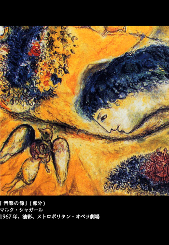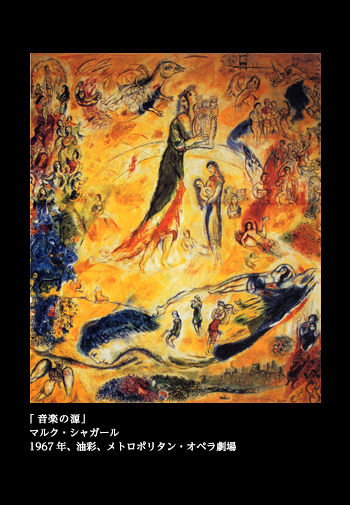 シャガールは音楽、劇場と馴染みの深い画家だった。「魔笛」や「ダフニスとクロエ」、「火の鳥」などの作品は、実際の公演で、舞台装置と衣装デザインを担当したこともある。