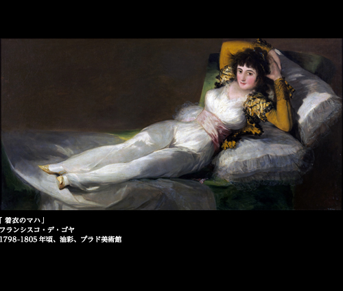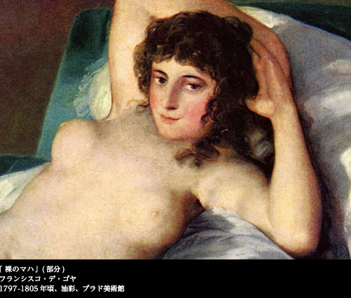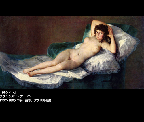 西洋絵画の裸婦像の中でもとびきり人気の高いある名画も、やはりこの原理を踏まえていることを思い出した。ゴヤの「裸のマハ」――。言うまでもなく、「着衣のマハ」と対をなす。同じ人物、同じポーズ、横たわるベッドも空間も同一である。