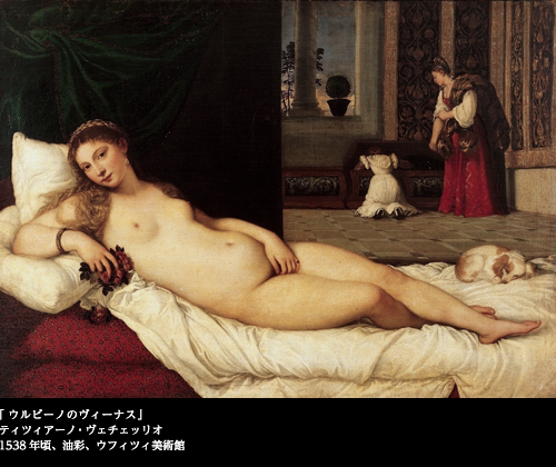 ゴヤの「裸のマハ」に見られた寝台に横たわり、こちらを向く裸婦の構図は、実は西洋絵画にあって様々な裸婦像に踏襲されている。その大元となるのが、ティツィアーノの「ウルビーノのヴィーナス」だ。1538年頃の作というから、「裸のマハ」よりも260年ほど前に描かれたことになるが、実は裸婦の絵の伝統にあって、ひとつの典型を築いたエポックメイキング的な作品であった。構図ばかりではない、ふくよかな白い肢体の輝きが放つ官能美の表現もまた、裸婦像として金字塔を打ち立てた。