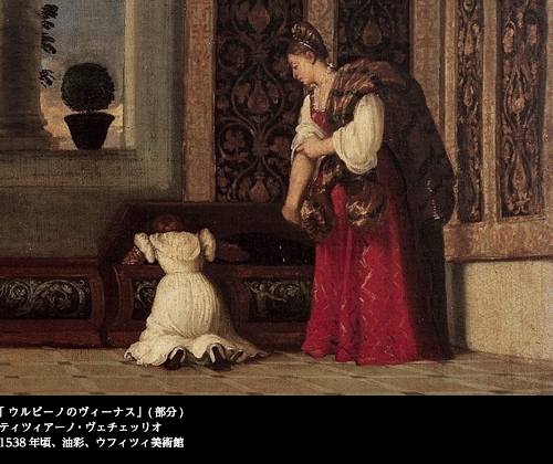 いまひとつは、空間と背景の差である。ジョルジョーネは実際の風景ではない理想的田園風景の中に眠れるヴィーナスを置いた。つまりは、どこまでも神話的空間であった。が、ティツィアーノは貴族の館らしき瀟洒な部屋の寝台へとヴィーナスを移した。あくまでも現実を生きる生身の女性なのである。ヴィーナス絵画によく見られるキューピッドも鳩や白鳥も、ここには登場しない。美神を神話から解き放ち、大胆にも世俗性のまつらう人間世界に生き生きと再生させたのだ。