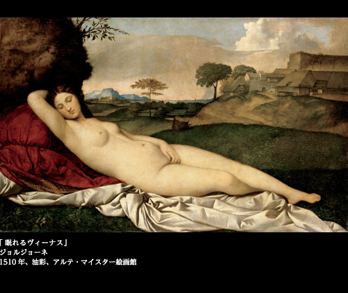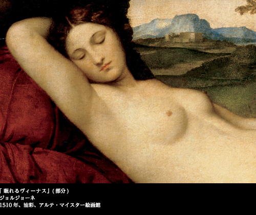 横臥する裸婦像の理想形として、後世に多大な影響を与えた絵だが、実は先駆的な作品が存在した。ジョルジョーネの「眠れるヴィーナス」――。横たわる裸婦のヴィーナス像としてはこちらが先にあり、そのスタイルをティツィアーノが発展的に模したことになる。もっとも、実はジョルジョーネの死後、絵を完成させたのが他ならぬティツィアーノだったので、先輩作家の絵に影響を受けたというレベルを超え、みずから橋渡しも果たしたことになる。